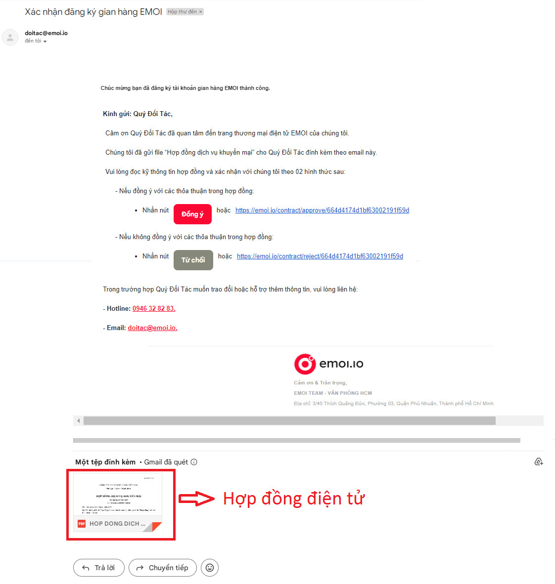 Bước 6. Sau khi đăng ký thành công, hệ thống EMOI.IO sẽ gửi cho bạn một hợp đồng điện tử qua email mà bạn đã đăng ký. Bấm chọn “Đồng ý” để đăng ký gian hàng